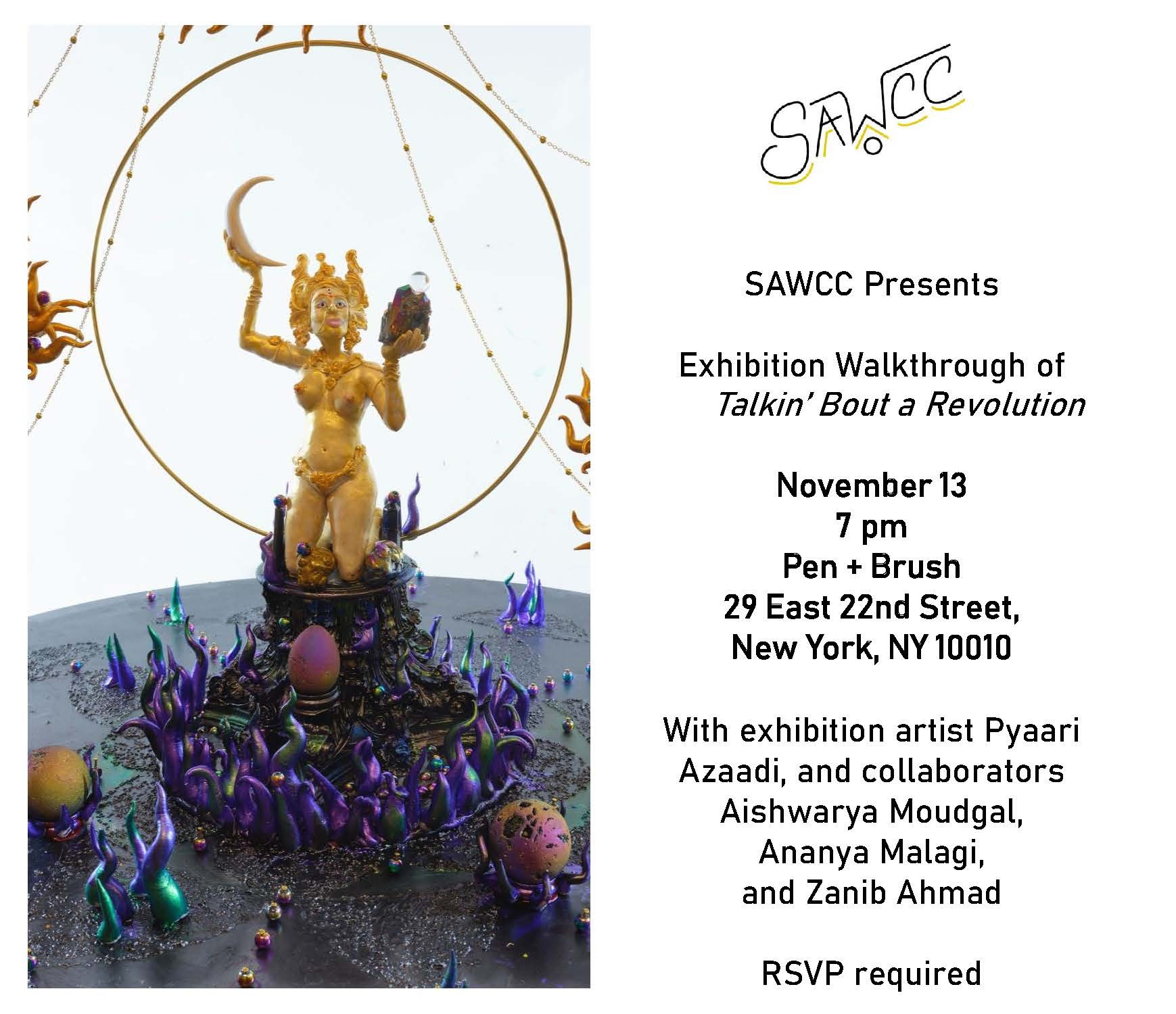 Join SAWCC on November 13 at 7 pm at Pen + Brush for a special walkthrough of Talkin’ Bout a Revolution, a solo exhibition spotlighting the work of Pyaari Azaadi, SAWCC founder and former board member. We will be joined by Pyaari Azaadi herself, as well as artist collaborators of the exhibition, Aishwarya Moudgal, Ananya Malagi, and Zanib Ahmad.